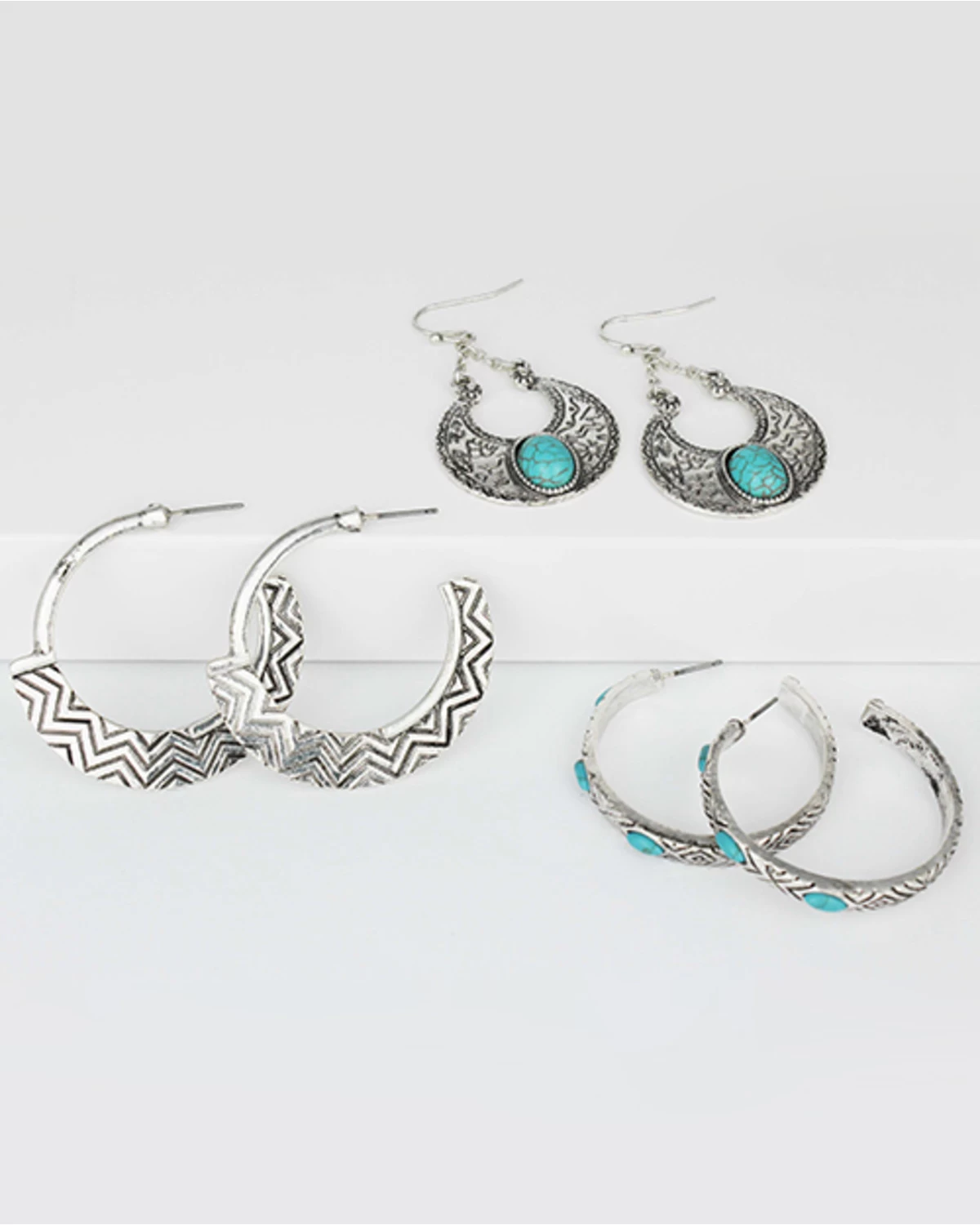 Prime Time Jewelry Women’s 3-piece Silver & Turquoise Hoop And Dangle Earrings Set